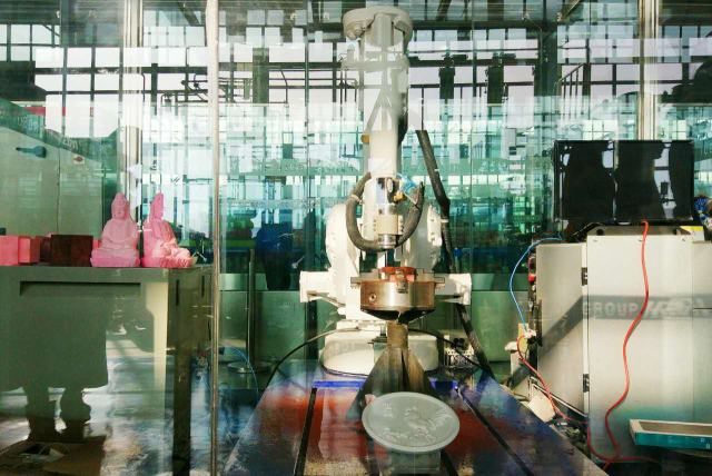 這是雕刻機器人,能夠?qū)浗饘倩蜍洸牧线M行高速鉆削和雕刻,還可以根據(jù)三維模型自動生成加工軌跡,比人工更加精準。