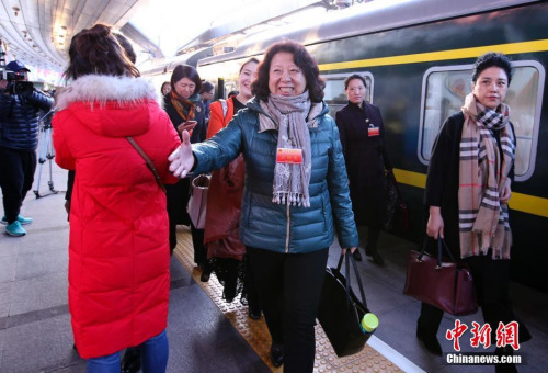 3月2日清晨,出席十二屆全國人大五次會議的黑龍江代表團乘火車抵達北京,成為首批抵京的京外代表。 中新社記者 劉震 攝