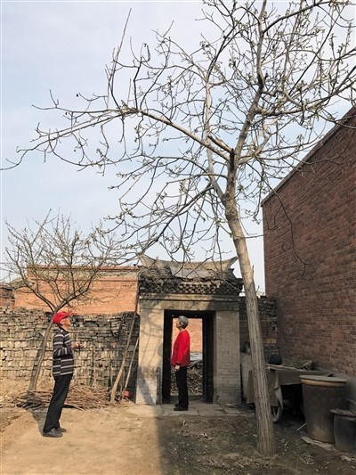 院里有桃樹、杏樹、葡萄、石榴樹。還有一棵20年的核桃樹,高5米,樹干有盤口那么粗。袁玉山說,別看這樹現在光禿禿的,到7月會結滿核桃,能有200斤,"不知道還有沒有機會吃到今年的核桃。"
