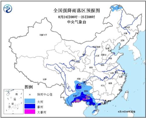 人民網(wǎng)北京8月24日電 中央氣象臺8月24日06時(shí)發(fā)布暴雨黃色預(yù)警:預(yù)計(jì)8月24日08時(shí)至25日08時(shí),廣東西南部、廣西西部和南部、海南島西北部、云南南部和東部、四川東南部、貴州大部等地有大到暴雨,其中,廣西西部、云南東南部等地的部分地區(qū)有大暴雨(100~180毫米),上述大部地區(qū)有短時(shí)強(qiáng)降水,小時(shí)最大降水量50~70毫米。