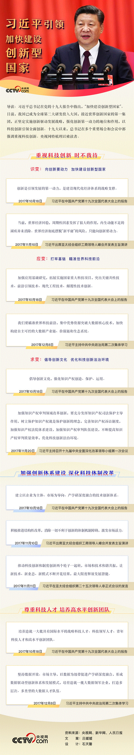 央視網消息:習近平總書記在黨的十九大報告中指出,“加快建設創新型國家”。目前,我國已成為全球第二大研發投入大國,接近世界創新國家的第一集團,正堅定實施創新驅動發展戰略,強化創新第一動力的地位和作用,以科技創新引領全面創新。十九大以來,總書記在多個重要場合和會議中都強調重視科技創新,央視網特梳理以饗讀者。