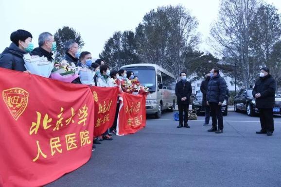 北京大學黨委書記邱水平,校長郝平,常務副校長、醫學部主任詹啟敏,黨委副書記、醫學部黨委書記劉玉村和黨委常委、副校長陳寶劍為即將出發的英雄們送行。