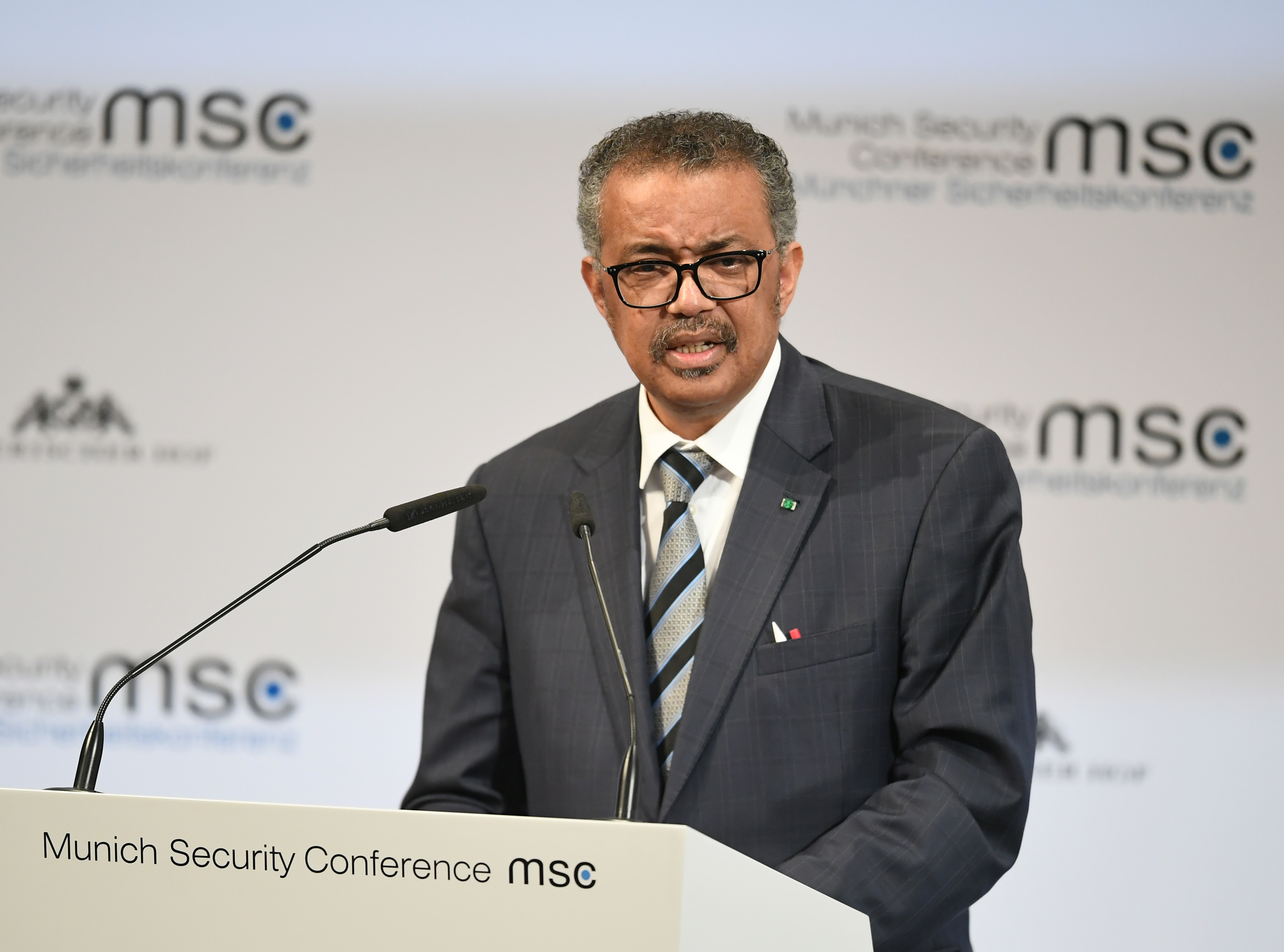 2月15日,在德國慕尼黑,世界衛生組織總干事譚德塞在第56屆慕尼黑安全會議上講話。譚德塞表示,中國采取的從源頭上控制新冠肺炎疫情的措施令人鼓舞,盡管這些措施讓中國付出了很大代價,但為世界爭取了時間,減緩了病毒向世界其他地方傳播的速度。新華社記者 逯陽 攝