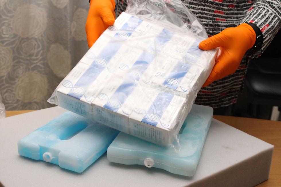 這是3月19日在貝寧經濟首都科托努舉行的捐贈儀式上拍攝的中國向貝寧衛生部捐贈的試劑盒。新華社發(塞拉芬攝)