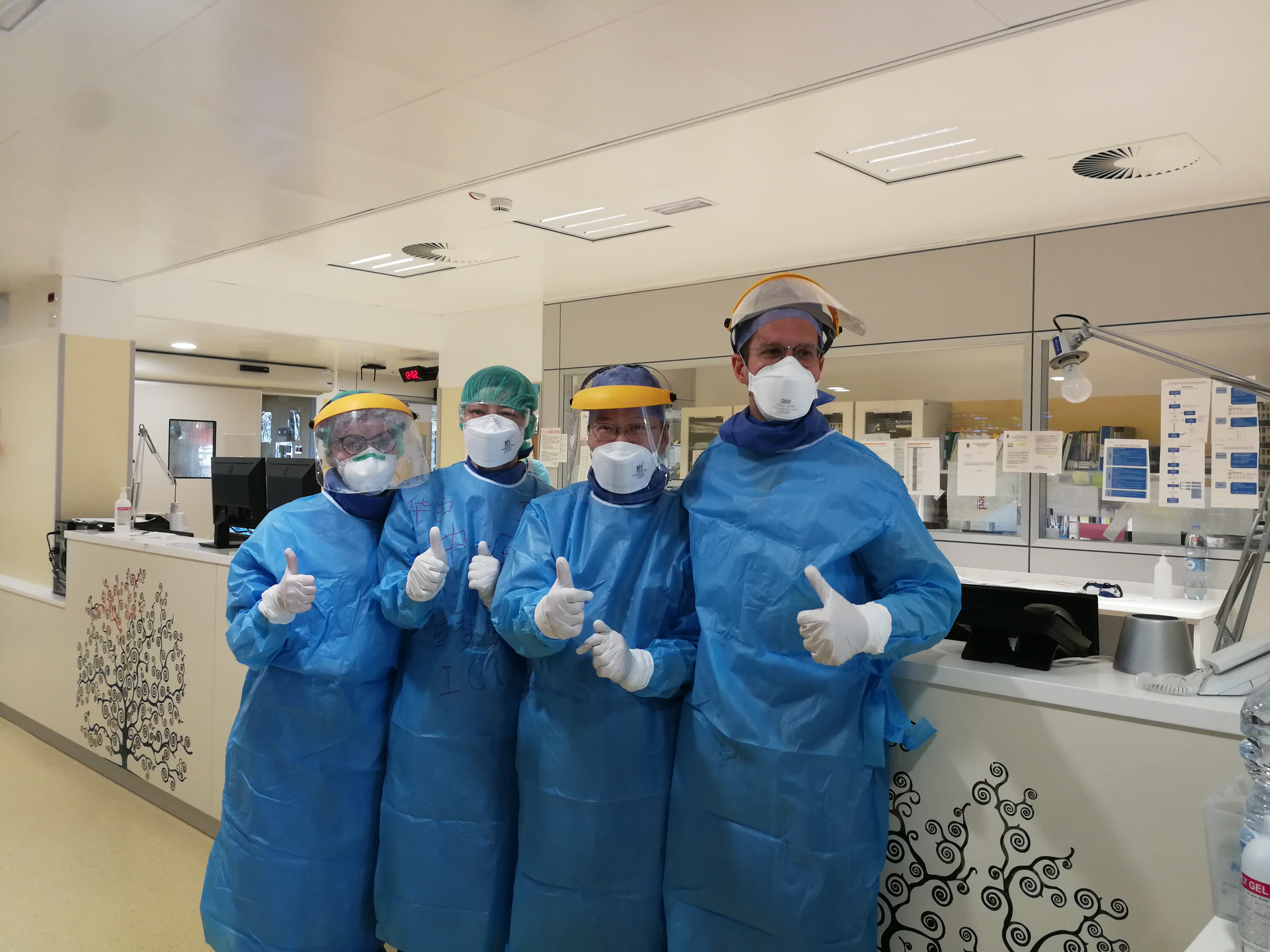 3月18日,在意大利帕多瓦,中國抗疫醫療專家組與當地醫生合影。中國抗疫醫療專家組在帕多瓦開展工作,幫助當地應對新冠肺炎疫情。新華社發(中國抗疫醫療專家組供圖)