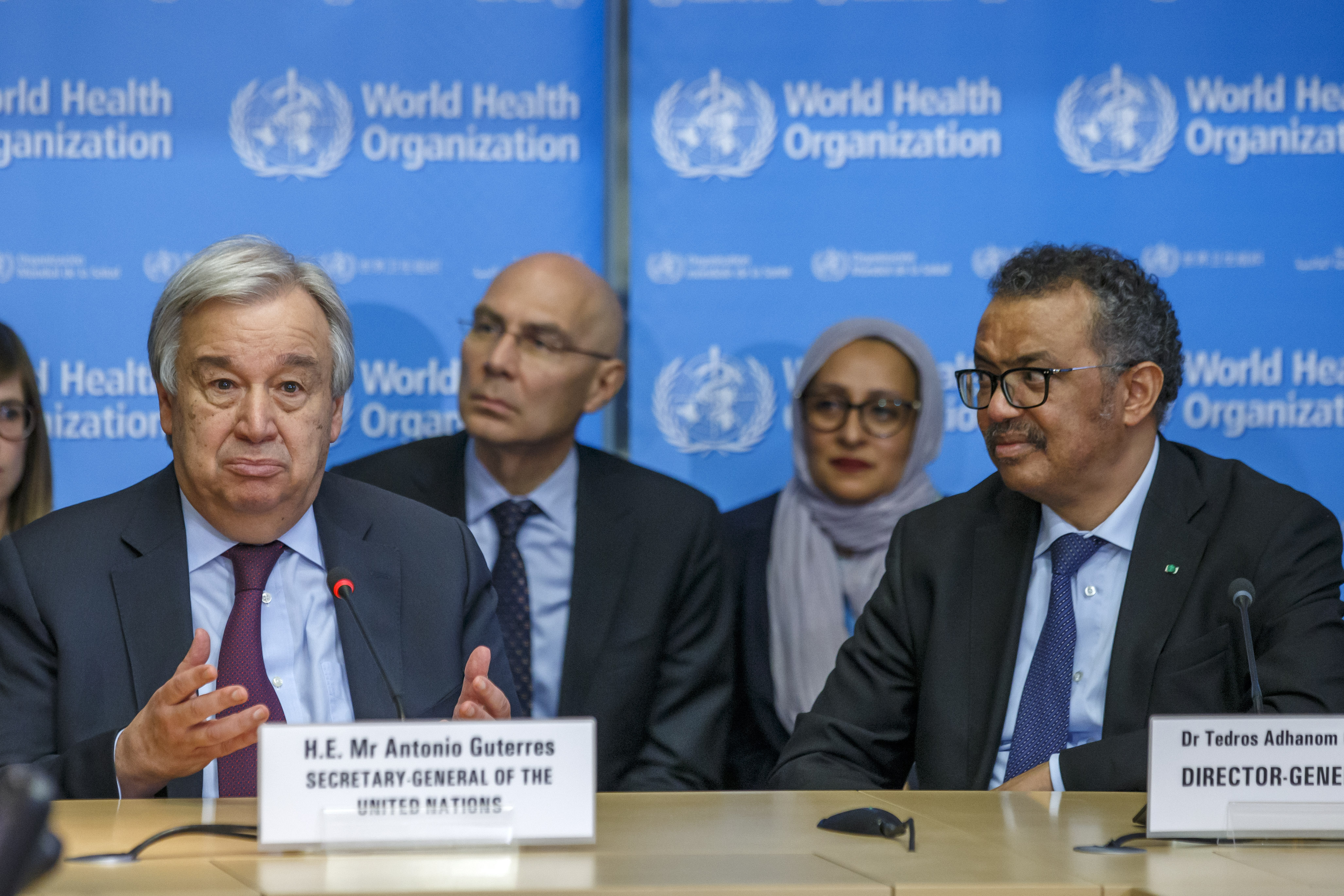 2月24日,在瑞士日內瓦,聯合國秘書長古特雷斯(左)在世界衛生組織總部發表講話。古特雷斯表示,中國人民為盡量減輕新冠肺炎疫情造成的負面影響,實施嚴格的防控措施,以犧牲正常生活的方式為全人類做出了貢獻。新華社發