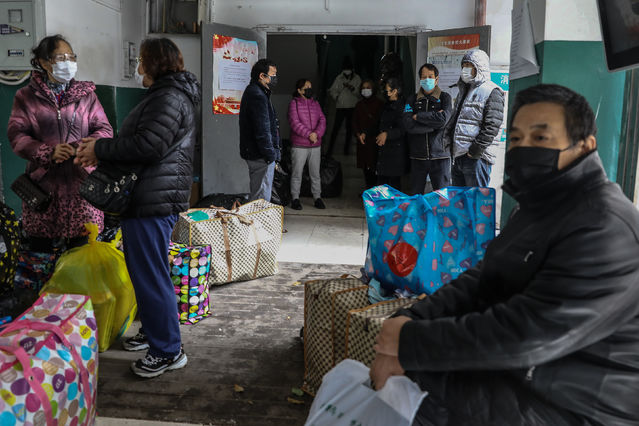3月27日,武漢軟件工程職業學院康復驛站,幾名結束康復隔離的觀察者在等待乘車離開。他們被送至集中樞紐點后,由社區派車接至家中。中青報·中青網記者 趙迪/攝
