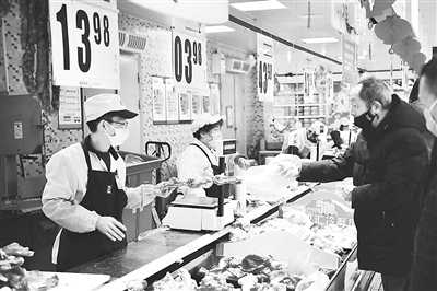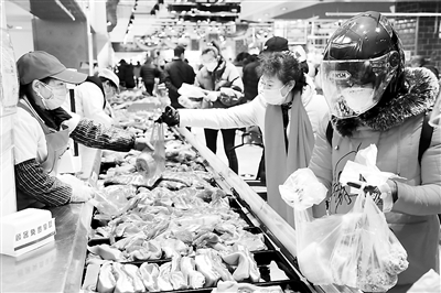 近來,各地采取多種措施,在疫情防控期間保障豬肉市場供應,滿足居民消費需求。圖為市民在河南省鄭州市一家大型超市內采購豬肉。