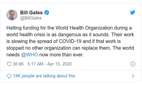△比爾·蓋茨發(fā)推批評(píng)特朗普對(duì)世衛(wèi)組織撤資的行為