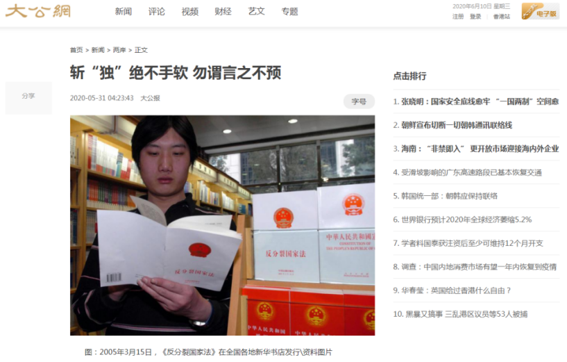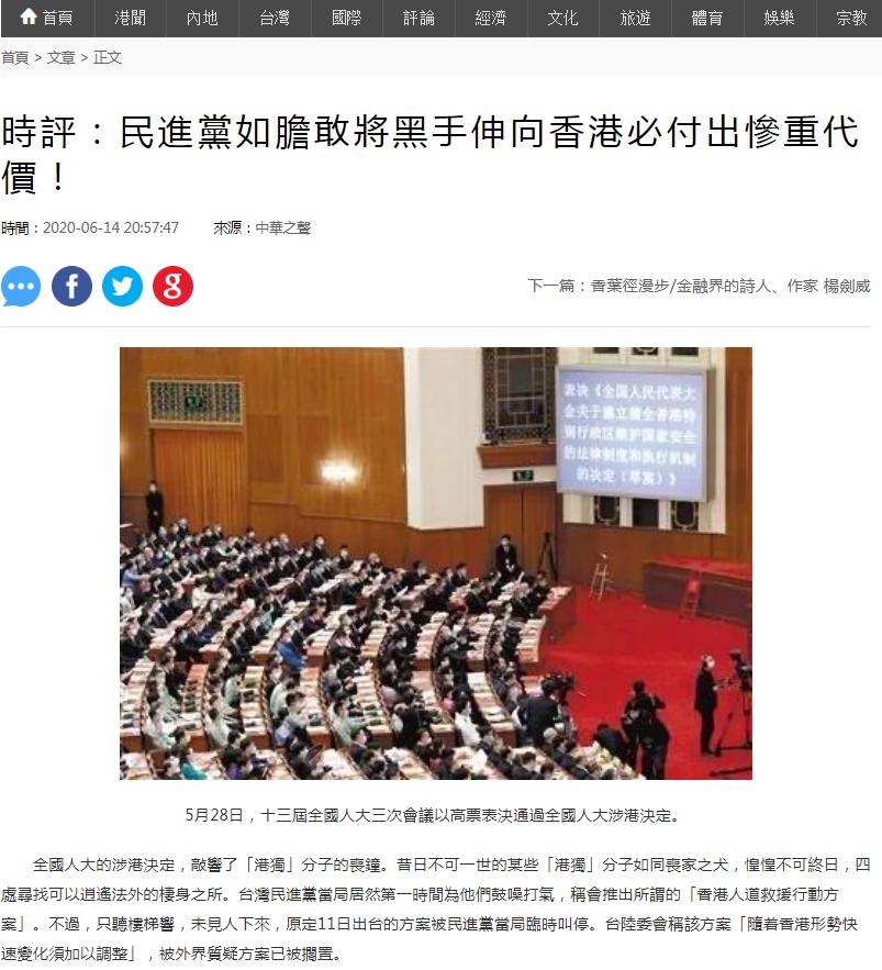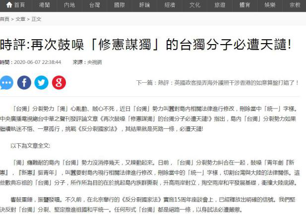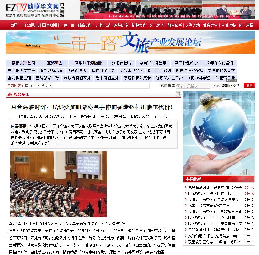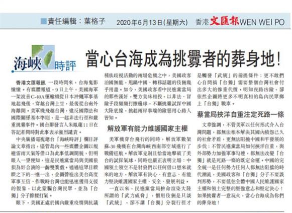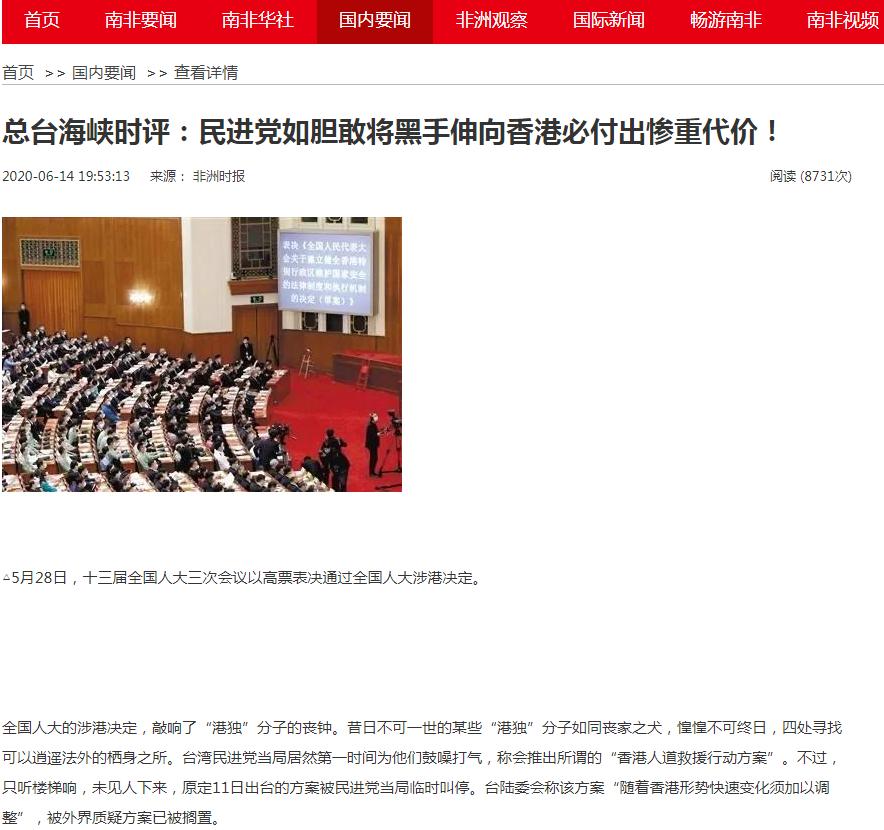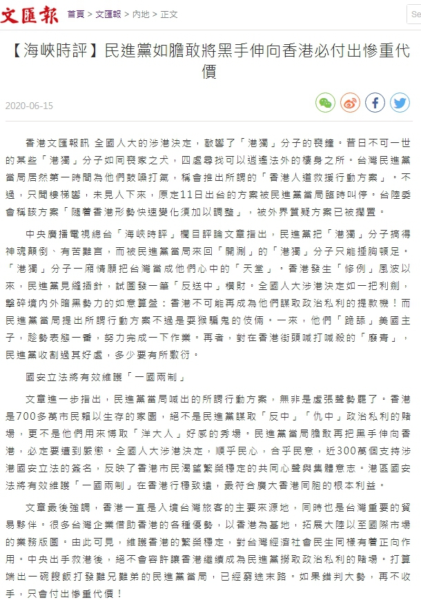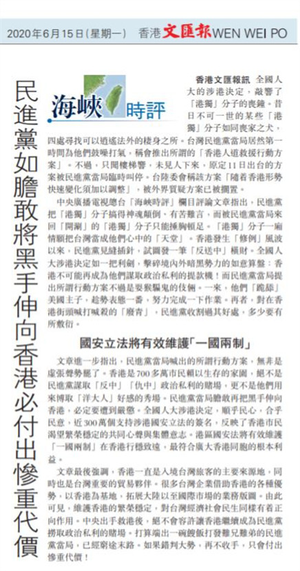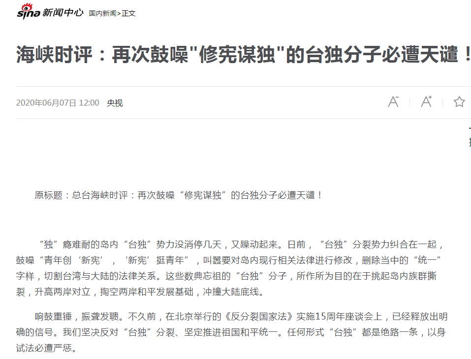 5月30日以來,結合社會各界聚焦《反分裂國家法》實施15周年,總臺《海峽時評》連續推出《斬“獨”除惡 絕不手軟》《民進黨當局若“以武拒統”就是自掘墳墓》《再次鼓噪“修憲謀獨”的臺獨分子必遭天譴!》《阻礙陸生回臺返校,民進黨當局自尋絕路》《當心臺海成為挑釁者的葬身地!》《民進黨如膽敢將黑手伸向香港必付出慘重代價!》等6篇評論,再次發出堅決打擊“臺獨”分裂勢力的最強音,引起海內外媒體的廣泛關注與認同。香港《文匯報》、《大公報》、鳳凰網、《澳門月刊》、新浪網、臺海網、ZAKER新聞等國內媒體,以及星島環球網、意大利僑網、歐聯華文網、《葡新報》、《非洲時報》等眾多海外媒體迅速轉載引用《海峽時評》文章,又一次形成揭批“臺獨”分裂勢力的輿論強勢。