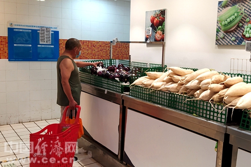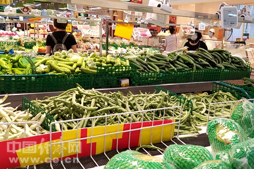 今日,經(jīng)濟日報-中國經(jīng)濟網(wǎng)記者對位于北京南三環(huán)某連鎖超市進行了走訪。在生鮮區(qū)的水果銷售區(qū),包括櫻桃、西瓜、藍莓、荔枝、山竹等各類時令水果整齊排列供人挑選,個別水果還有優(yōu)惠活動。同在該超市的蔬菜區(qū),盡管過了上午買菜的高峰時段,但仍有消費者在挑選蔬菜,除個別特價商品銷售見底外,大部分蔬菜供應充足,并有吃過午飯的理貨員在整理菜架,準備補貨。