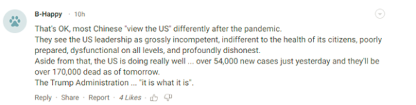不過,從美國(guó)網(wǎng)民的反對(duì)聲來看,越來越多的明眼人已經(jīng)對(duì)這類抹黑說辭有了免疫力。有網(wǎng)友就接著特朗普的話反唇相譏:“在疫情大流行之后,大多數(shù)中國(guó)人對(duì)美國(guó)的看法也不同了。”