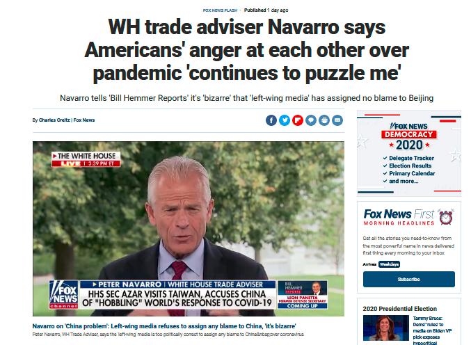 特朗普的一眾得力干將們也沒閑著。幾乎就在這位總統(tǒng)大肆污名化中國(guó)的同時(shí),白宮國(guó)家貿(mào)易和制造業(yè)政策辦公室主任彼得·納瓦羅也再次借疫情給中國(guó)潑臟水。他在接受福克斯新聞采訪時(shí)稱,美國(guó)人對(duì)新冠肺炎疫情的憤怒主要是針對(duì)美國(guó)同胞,而不是轉(zhuǎn)向中國(guó),這讓他“困惑”。
