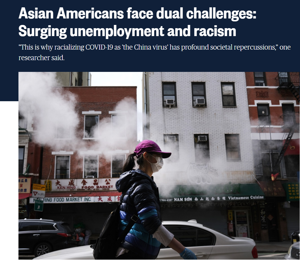 美國(guó)全國(guó)廣播公司(NBC)報(bào)道:亞裔美國(guó)人面臨雙重挑戰(zhàn):失業(yè)和種族主義歧視急劇增加。一位研究人員說:“這就是為什么將新冠肺炎污名化化為'中國(guó)病毒'會(huì)產(chǎn)生深遠(yuǎn)的社會(huì)影響。”