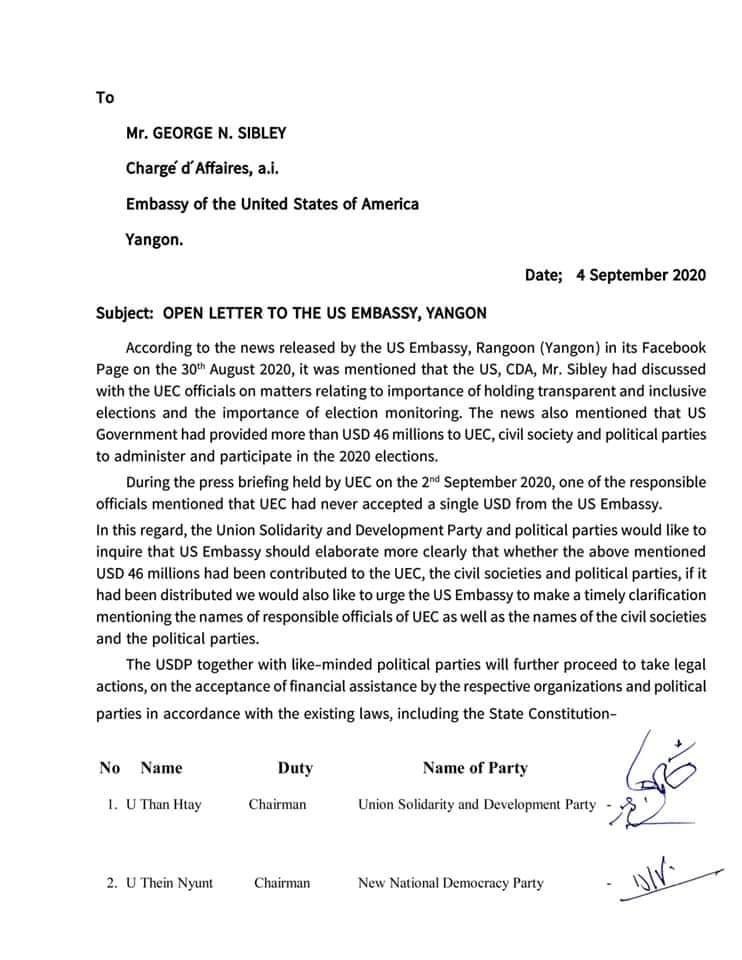 緬甸25家政黨聯合發表公開信 質疑美國所宣稱的大選援助資金去向