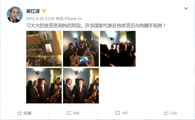 時任聯(lián)合國副秘書長吳紅波說,習(xí)主席走下講臺時,二三十位其他國家領(lǐng)導(dǎo)人排隊(duì)與他握手表示祝賀,走廊里擠得滿滿當(dāng)當(dāng)。
