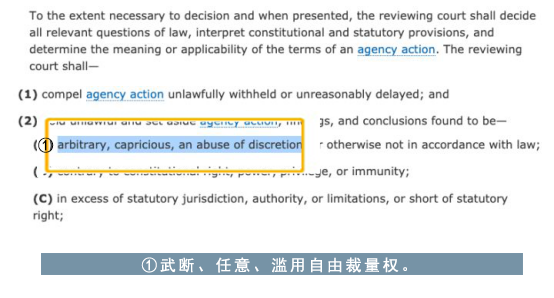 當法院認定政府機構的行為“武斷、反復無常、濫用自由裁量權或在其他方面不符合法律規定”、“超過法定標準”或者“未遵守法律規定的程序”時,有權判定該行為違法。