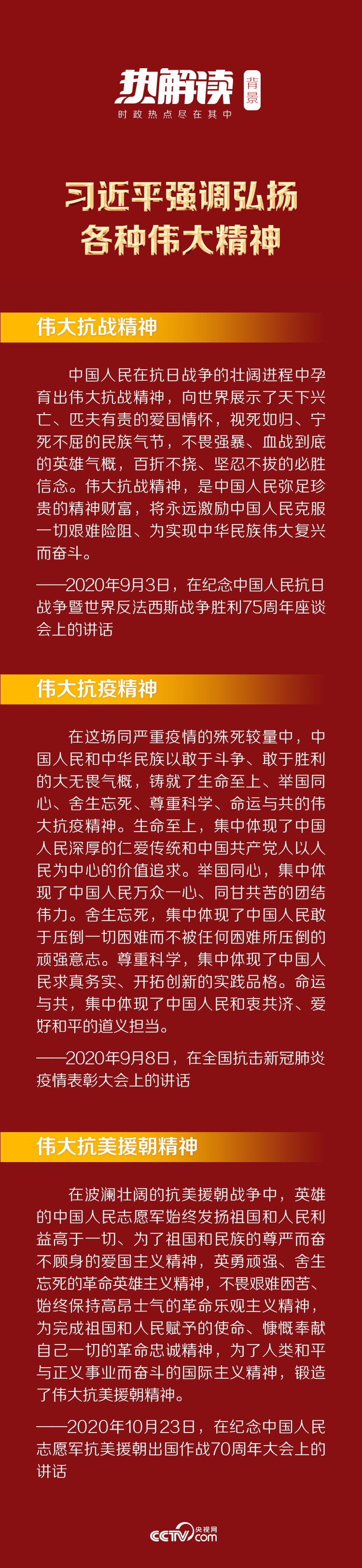 今年以來,總書記多次詮釋各種精神:偉大抗戰精神、偉大抗疫精神、偉大抗美援朝精神……在歷史回響中,帶我們接受思想洗禮,汲取奮勇前行的精神力量。