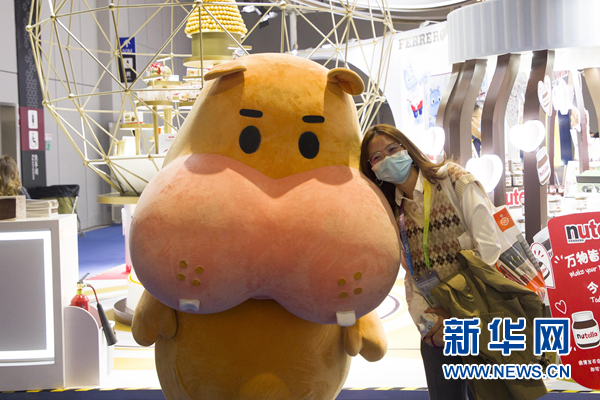 觀眾在第三屆進博會上的食品及農產品展區與人偶合影(11月5日攝)。新華網 吳一航 攝