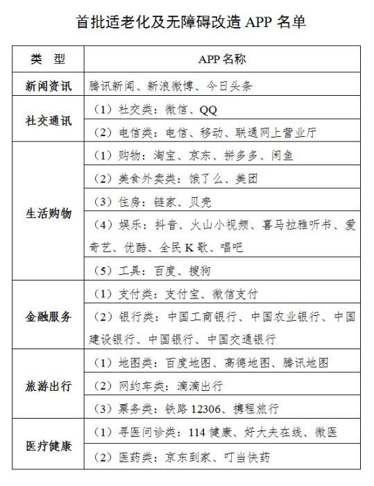 開展老年人、殘疾人常用移動(dòng)互聯(lián)網(wǎng)應(yīng)用(APP)的適老化及無障礙改造。立足老年人、殘疾人的實(shí)際生活體驗(yàn),豐富滿足其需求的移動(dòng)互聯(lián)網(wǎng)應(yīng)用(APP)種類和功能,對(duì)《工業(yè)和信息化部 中國殘疾人聯(lián)合會(huì)關(guān)于推進(jìn)信息無障礙的指導(dǎo)意見》(工信部聯(lián)信管〔2020〕146號(hào))中列出的移動(dòng)互聯(lián)網(wǎng)應(yīng)用十大領(lǐng)域、注冊(cè)用戶數(shù)超過5000萬人、同類產(chǎn)品中市場(chǎng)份額排名前5名的APP進(jìn)行適老化及無障礙改造。首批優(yōu)先推動(dòng)新聞資訊、社交通訊、生活購物、金融服務(wù)、旅游出行、醫(yī)療健康等6大類、共43個(gè)APP進(jìn)行適老化及無障礙改造(APP名單見附件2)。中國信息通信研究院協(xié)助各互聯(lián)網(wǎng)企業(yè),在開發(fā)設(shè)計(jì)移動(dòng)互聯(lián)網(wǎng)應(yīng)用(APP)的過程中落實(shí)信息無障礙有關(guān)標(biāo)準(zhǔn)的要求,并將無障礙優(yōu)化納入產(chǎn)品及服務(wù)的日常維護(hù)流程。
