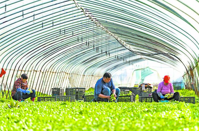 上圖 2月18日,位于安徽省合肥市肥東縣撮鎮鎮的安徽一元菜生態有限公司蔬菜基地內,工人忙著采收、搬運蔬菜。阮雪楓攝 左圖 2月18日,江西省贛州市章貢區華星源農機有限公司,農戶正在選購農機。胡江濤攝