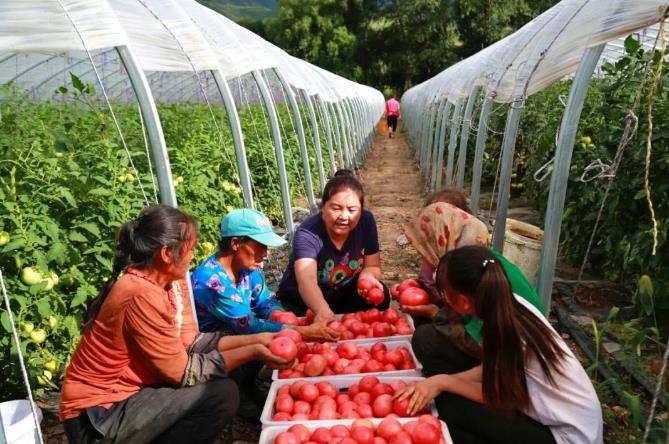 十三屆全國(guó)人大代表、內(nèi)蒙古自治區(qū)赤峰市小廟子村黨總支書(shū)記趙會(huì)杰(中)在蔬菜大棚了解西紅柿的生長(zhǎng)情況。(資料照片)