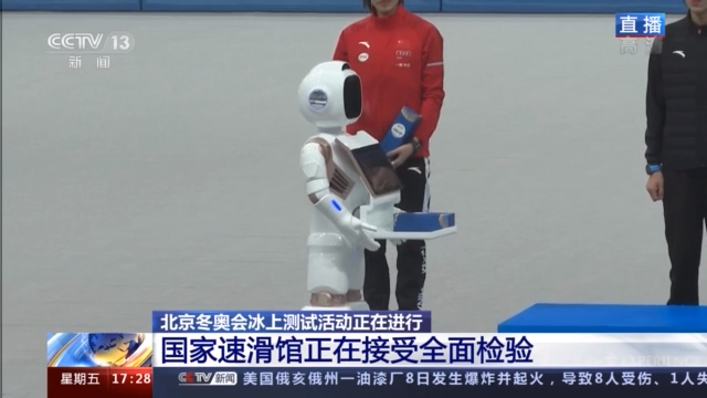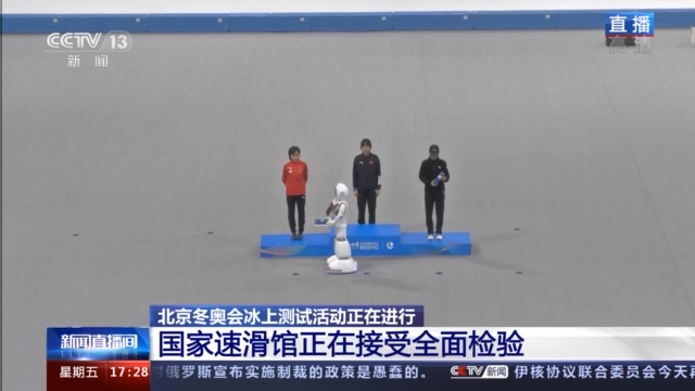 總臺記者 何暢:我現在正是在國家速滑館的比賽場地,現場目前正在進行的頒獎測試活動非常有意思,我們可以看到頒獎嘉賓正在給運動員頒獎,它可不是一般人,它是一臺智能機器人,別看這個智能機器人走起路來的樣子萌萌噠,實際上能力還不小,一方面它可以給運動員進行這種無接觸的頒獎;另外一方面,它可以識別運動員的身份,通過不同的語言去給運動員進行祝賀,比如像中文的“恭喜你,你滑得真是太棒了”,包括英文的“congratulations”等等。目前這臺機器人還在測試當中,我們相信未來它將會具備更加嫻熟的頒獎動作,同時也能儲備更多的語言。