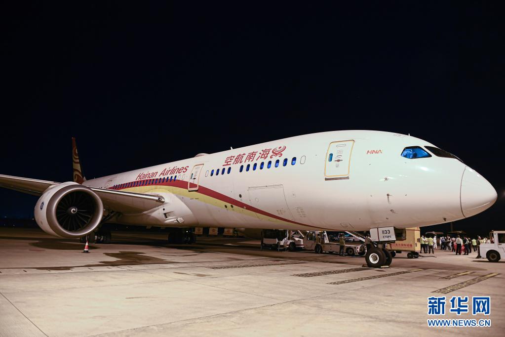 這是3月26日在海口美蘭國際機場拍攝的海南航空HU787航班。3月27日凌晨,該航班搭載貨物從海口飛往法國巴黎,海南自貿港首條定期洲際貨運航線正式開通。新華社記者 蒲曉旭 攝