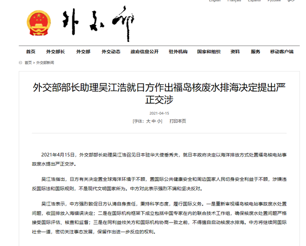 中國臺灣網4月15日訊 據外交部官網消息, 2021年4月15日,外交部部長助理吳江浩召見日本駐華大使垂秀夫,就日本政府決定以海洋排放方式處置福島核電站事故廢水提出嚴正交涉。