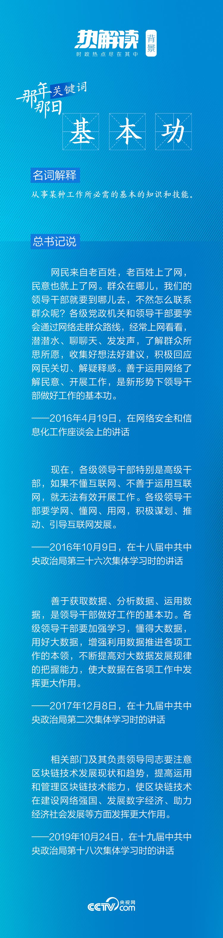 《熱解讀》關注到,這次重要講話中所提的“基本功”,之后總書記又多次提及,并反復強調互聯網時代領導干部“運用網絡”的重要意義。