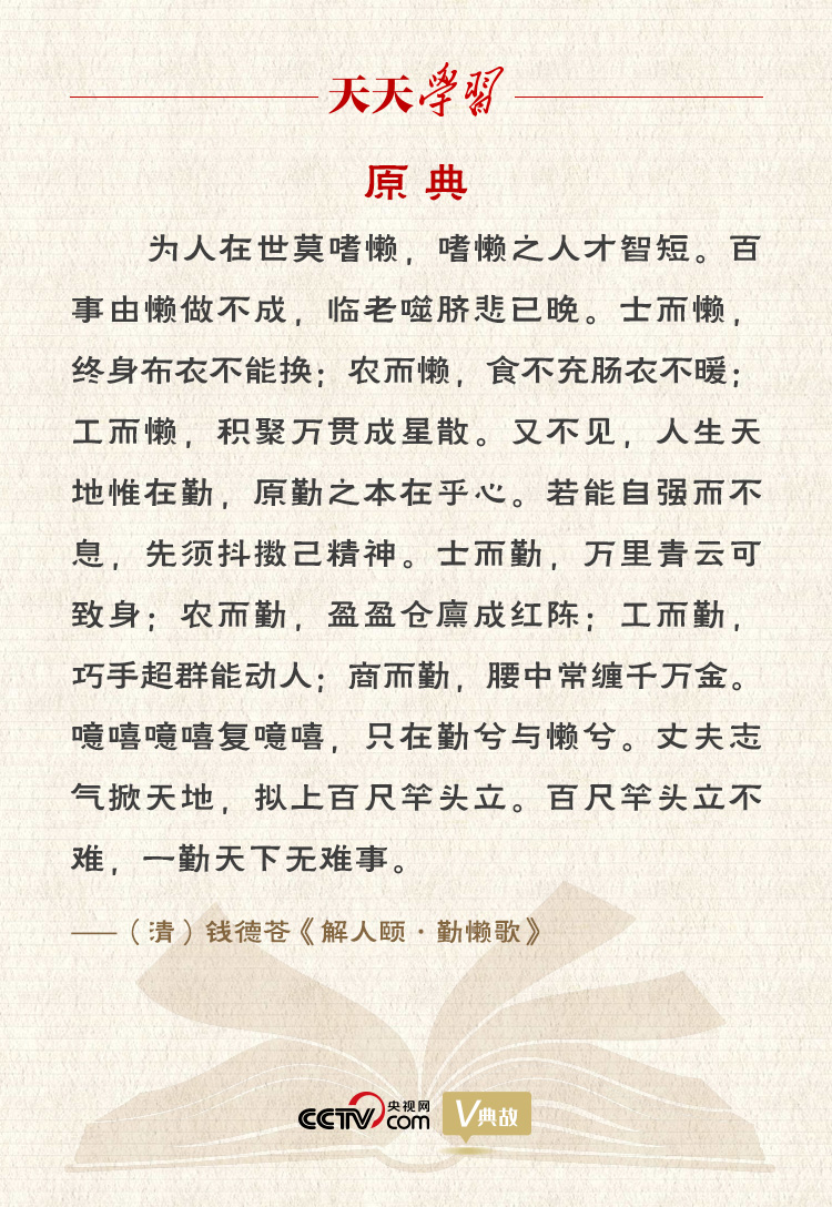 《解人頤》收錄的這首《勤懶歌》,是對古代的“四民”——士、農、工、商勸勤戒懶。結語“百尺竿頭立不難,一勤天下無難事”,意思是,只要勤奮,天下就沒有難做的事情,即使百尺竿頭也能昂然挺立!鞍俪吒皖^”,佛教比喻道行修養的極高境界,也作“百丈竿頭”。