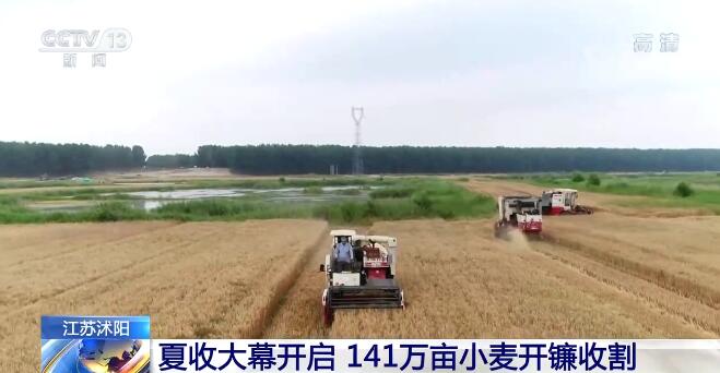 在江蘇沭陽縣,141萬畝小麥開鐮收割。伴隨著機器的轟鳴聲,收割機在金色的麥浪中來回馳騁,飽滿的麥粒歡快地蹦進車倉。