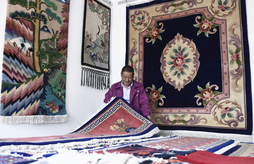 ↑6月5日,在西寧市湟中縣加牙村,國(guó)家級(jí)非物質(zhì)文化遺產(chǎn)項(xiàng)目加牙藏族織毯技藝傳承人楊永良在整理制作好的藏毯。