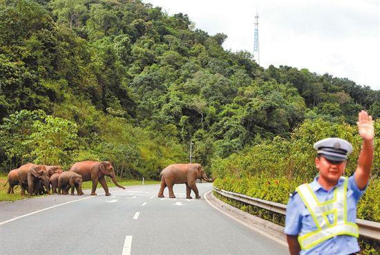 交警護(hù)航野象橫穿高速路