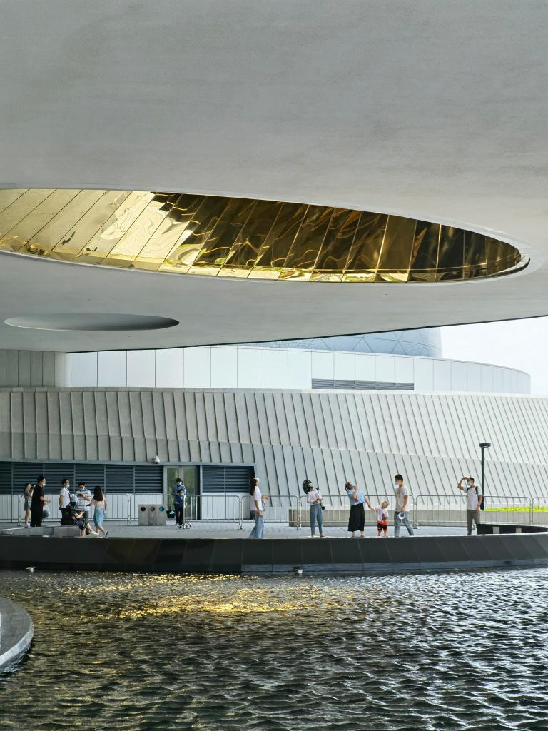 這座場館與周圍環境相得益彰。球幕影院的球體外直徑30米,如果把同樣位于臨港的滴水湖比作太陽,球幕影院就是等比例縮小的地球。主建筑外的景觀區域還設計了3組螺旋形的綠化帶,從主建筑向外自然延伸出去,并與外圍的“星空之境”公園自然銜接,充分體現了建筑與生態的有機融合。