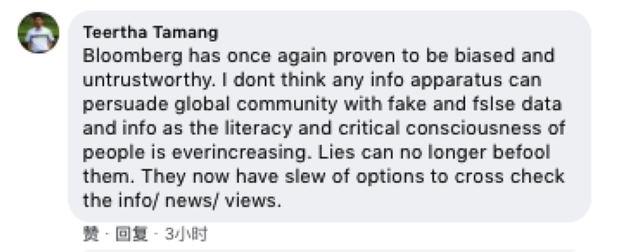 網友Teertha Tamang留言:“彭博社再次被證明是有偏見的、不值得信任的。我不認為任何信息機構可以用虛假的數據和信息來說服全球民眾,因為人們的讀寫能力和批判意識在不斷提高。謊言再也騙不了他們了。他們現在有大量的選項來交叉檢查信息、新聞、觀點。”