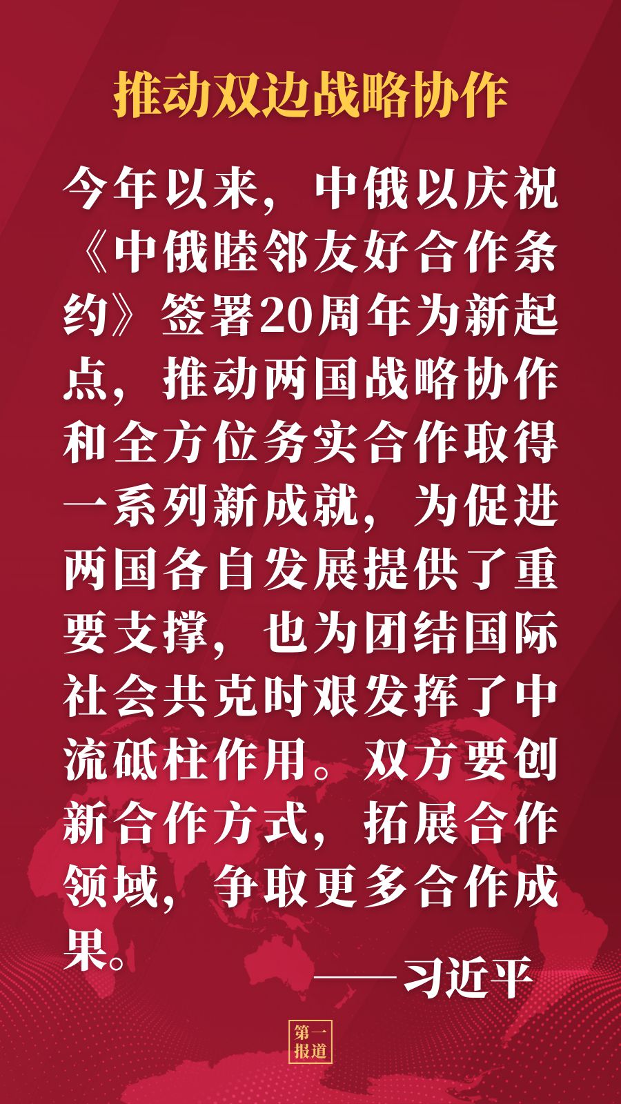 習近平指出,今年以來,中俄以慶祝《中俄睦鄰友好合作條約》簽署20周年為新起點,推動兩國戰略協作和全方位務實合作取得一系列新成就,為促進兩國各自發展提供了重要支撐,也為團結國際社會共克時艱發揮了中流砥柱作用。雙方要創新合作方式,拓展合作領域,爭取更多合作成果。當前,新冠肺炎疫情起伏不定,國際抗疫任務艱巨,中方愿同俄方深化疫苗研發生產合作,保障疫苗全球供應鏈安全穩定,維護兩國人民生命安全和身體健康,為構建人類衛生健康共同體貢獻中俄力量。