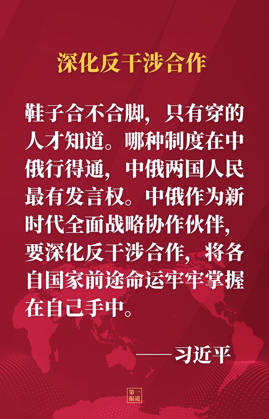 習近平強調,鞋子合不合腳,只有穿的人才知道。哪種制度在中俄行得通,中俄兩國人民最有發言權。中俄作為新時代全面戰略協作伙伴,要深化反干涉合作,將各自國家前途命運牢牢掌握在自己手中。中方堅定支持俄羅斯走符合本國國情的發展道路,堅定支持俄方為維護國家主權安全所采取的舉措。雙方要以今年上海合作組織成立20周年為契機,同成員國一道,加強團結協作,加大相互支持,維護地區國家安全和發展利益。