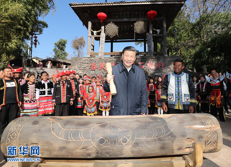2020年1月19日至21日,中共中央總書記、國家主席、中央軍委主席習近平來到云南,看望慰問各族干部群眾,向全國人民致以新春祝福。這是19日下午,習近平在騰沖市清水鄉三家村中寨司莫拉佤族村廣場上,敲響三聲佤族木鼓,祝福來年風調雨順、國泰民安。 新華社記者 鞠鵬 攝