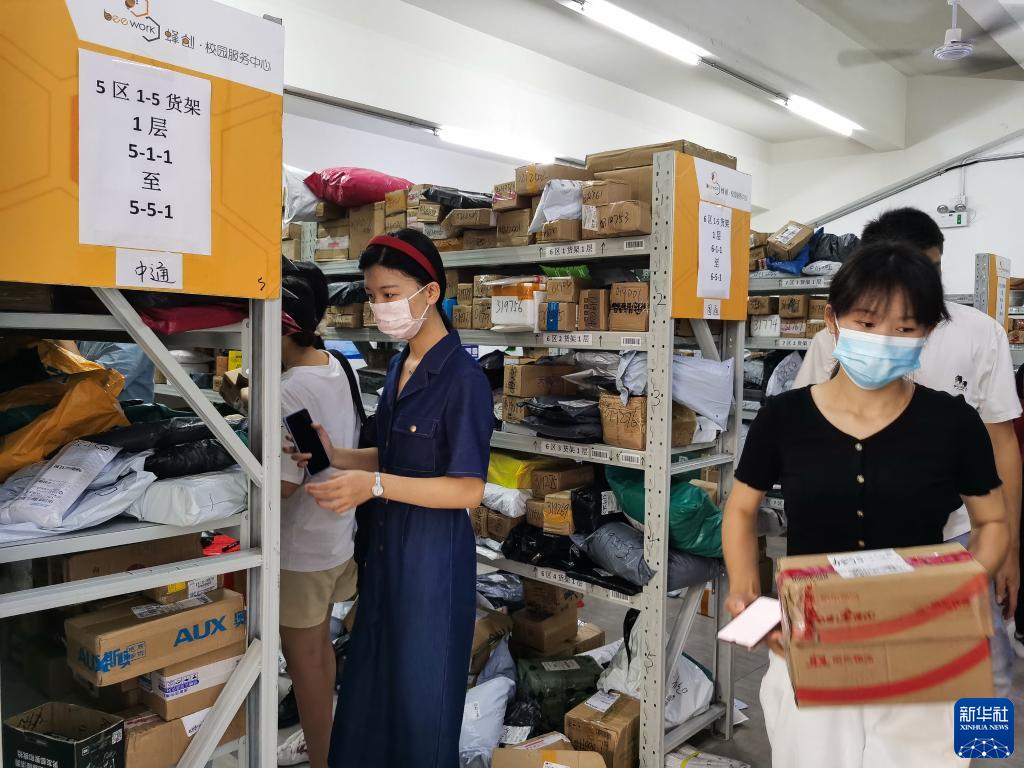 9月4日,入學(xué)新生在華南理工大學(xué)廣州國(guó)際校區(qū)宿舍樓快遞包裹庫(kù)房查找快遞。