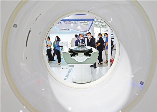 觀眾在2021年中國國際服務貿易交易會智慧交通服務展位“開往世界的列車”前拍照。服貿會是全球服務貿易領域規模最大、內容最豐富的國際展會,也是我國促進高水平對外開放的重要平臺。
