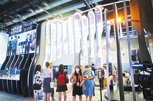 服貿會香港館展區頗具特色,通過運用新材料制成的開放性波浪結構,寓意把內地和香港的優勢疊加起來,共同打造更新更優的服務貿易應用場景。