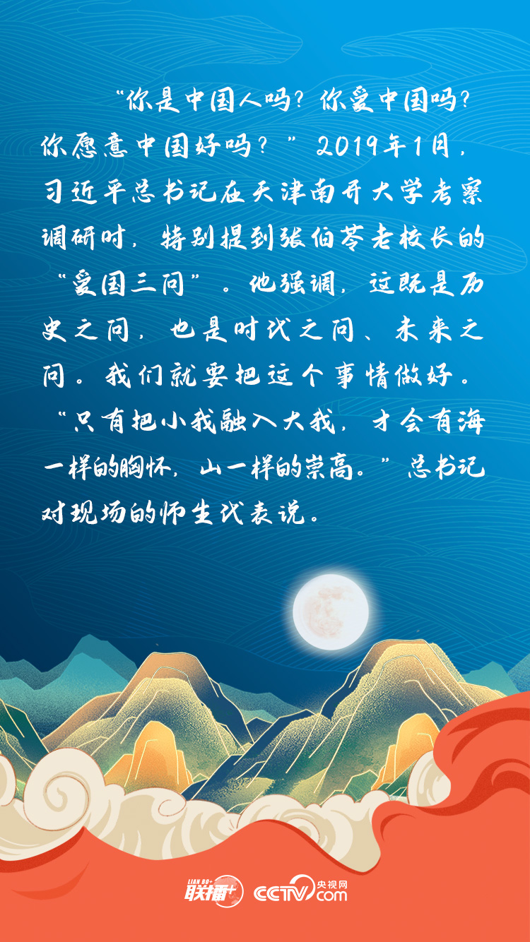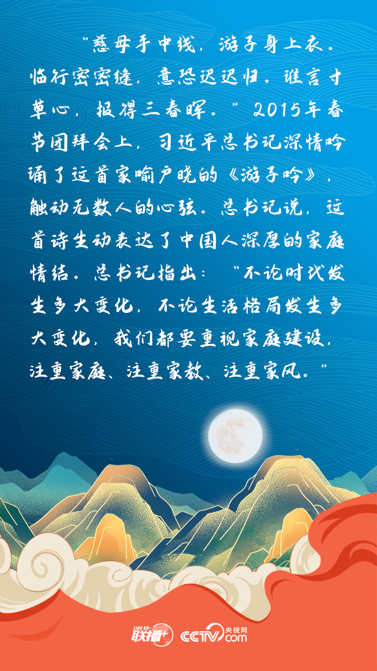 家是最小國,國是千萬家。黨的十八大以來,習近平總書記多次強調要重視家庭建設,提倡把愛家和愛國統一起來,把實現個人夢、家庭夢融入國家夢、民族夢之中。中秋佳節即將到來之際,央視網《聯播+》欄目為您擷取總書記闡釋家國情懷的小故事,與您一起感受總書記心中的家國情。