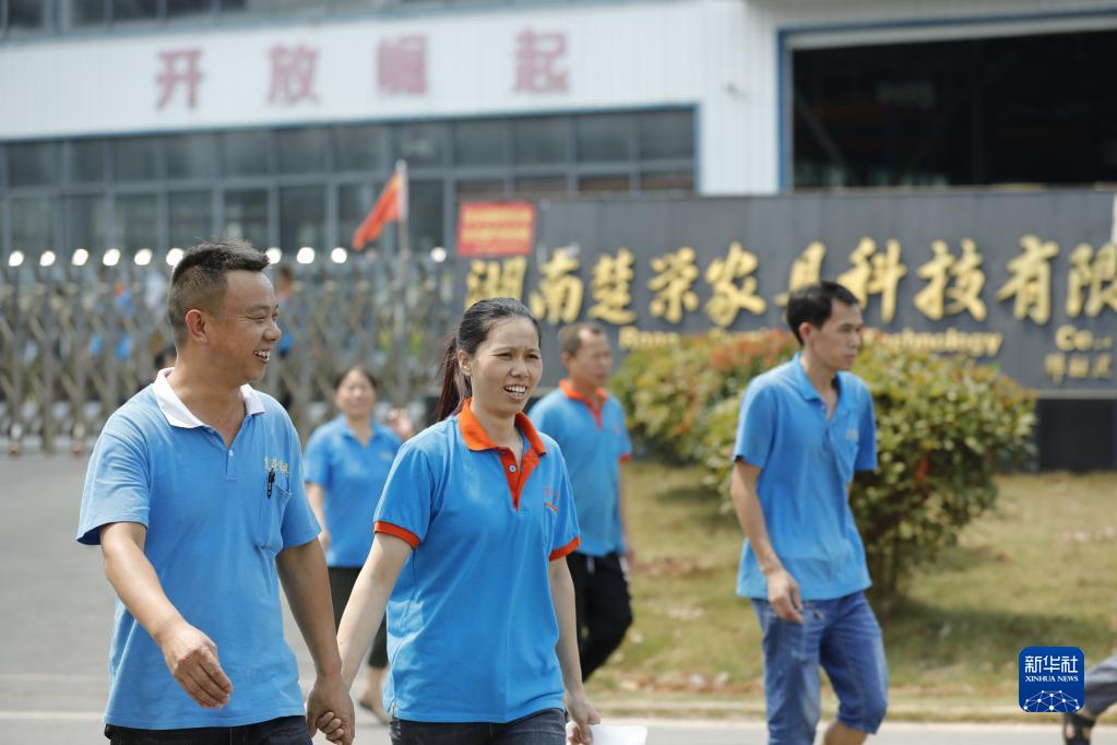 9月17日,陳輝(左一)和妻子中午下班后走在湖南廣東(桂陽)家居智造產(chǎn)業(yè)園里。 新華社發(fā)(戴奇成 攝)