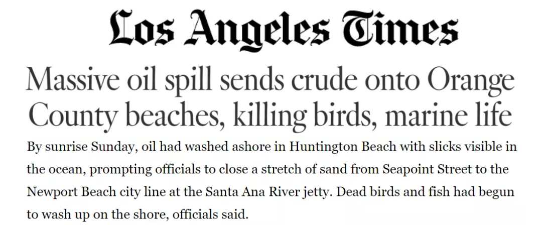 1990年,加州南部海岸發生油輪泄漏事故,41.7萬加侖原油流入海中,導致奧蘭治縣沿岸大量魚類和約3400只海鳥死亡;