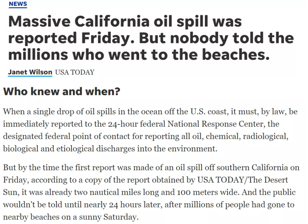 據《今日美國報》報道,加州州長緊急服務辦公室在當地時間1日傍晚6點左右就收到原油泄漏的相關消息,然而,有關部門卻隱瞞了這一消息近24個小時后才向民眾公開。而發生泄漏事故的涉事石油公司第二天才通報管道泄漏的消息。這導致成千上萬名當地居民和游客2日前往被污染的海灘時,生命健康遭受嚴重威脅。