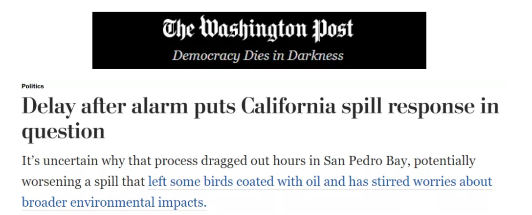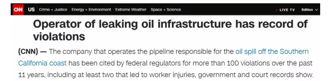 美國有線電視新聞網援引美國安全和環境執法局的數據報道稱,輸油管道運營商此前曾有上百起安全和環保違規事件。美國環保組織“環境加利福尼亞”負責人勞拉·迪安認為,相關部門沒有做好本職工作來防止石油公司對沿海區域和野生生物造成危害。