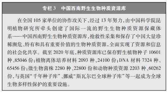 加快重要生物遺傳資源收集保存和利用。中國高度重視生物資源保護,近年來在生物資源調查、收集、保存等方面取得較大進展。實施戰略生物資源計劃專項,完善生物資源收集收藏平臺,建立種質資源創新平臺、遺傳資源衍生庫和天然化合物轉化平臺,持續加強野生生物資源保護和利用。實施一批種質資源保護和育種創新項目,截至2020年底,形成了以國家作物種質長期庫及其復份庫為核心、10座中期庫與43個種質圃為支撐的國家作物種質資源保護體系,建立了199個國家級畜禽遺傳資源保種場(區、庫),為90%以上的國家級畜禽遺傳資源保護名錄品種建立了國家級保種單位,長期保存作物種質資源52萬余份、畜禽遺傳資源96萬份。建設99個國家級林木種質資源保存庫,以及新疆、山東2個國家級林草種質資源設施保存庫國家分庫,保存林木種質資源4.7萬份。建設31個藥用植物種質資源保存圃和2個種質資源庫,保存種子種苗1.2萬多份。