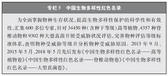 開展全國生物多樣性調查與評估。大力推進生物多樣性保護重大工程實施,結合自然資源調查、生態系統監測評估等工作,不斷完善生物多樣性調查與評估能力,首次將生物多樣性指標納入生態質量綜合評價指標體系,引導地方加強生態文明建設與生物多樣性保護。開展自然資源調查,包括森林、草原、水、濕地、荒漠、海洋等,建立自然資源調查評價監測制度。構建了涵蓋2376個縣級行政單元、樣線總長超過3.4萬公里的物種分布數據庫,建立物種資源調查及收集信息平臺,準確反映野生動植物空間分布狀況。完成長江經濟帶、京津冀等國家戰略區域180多個縣級行政區生物多樣性調查與評估。組織開展近海漁業資源調查,初步掌握近海漁業資源狀況。陸續發布《中國植物紅皮書》《中國瀕危動物紅皮書》《中國物種紅色名錄》《中國生物多樣性紅色名錄》,基本掌握生物多樣性總體情況,為加強生物多樣性保護奠定了科學基礎。