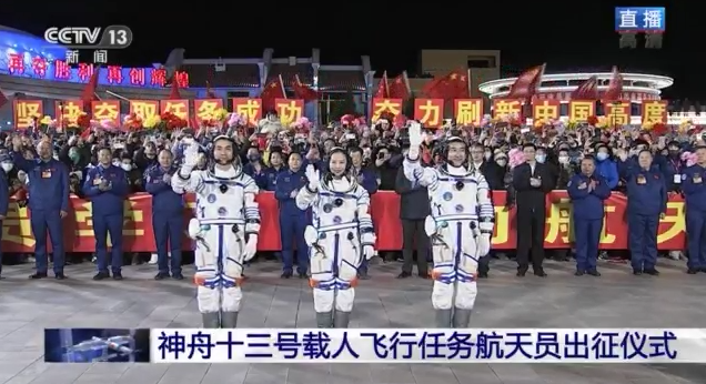 神舟十三號載人飛行任務航天員乘組出征儀式,在酒泉衛星發射中心問天閣廣場舉行。